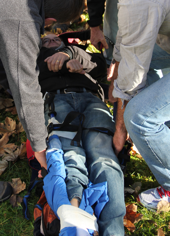 Using three backpacks, two walking poles, and one jacket to make a makeshift gurney...